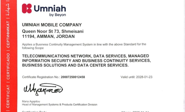 جدّدت شركة أمنية، إحدى شركات Beyon والمصنفة كأفضل شبكة موبايل في الأردن، شهادة نظام إدارة استمرارية الأعمال ISO 22301. وتأتي هذه الخطوة لتعكس جاهزيتها التشغيلية وقدرتها على ضمان استمرارية الأعمال والخدمات في مختلف الظروف، بما يعزز موثوقية شبكتها لدى الأفراد والمؤسسات في المملكة.