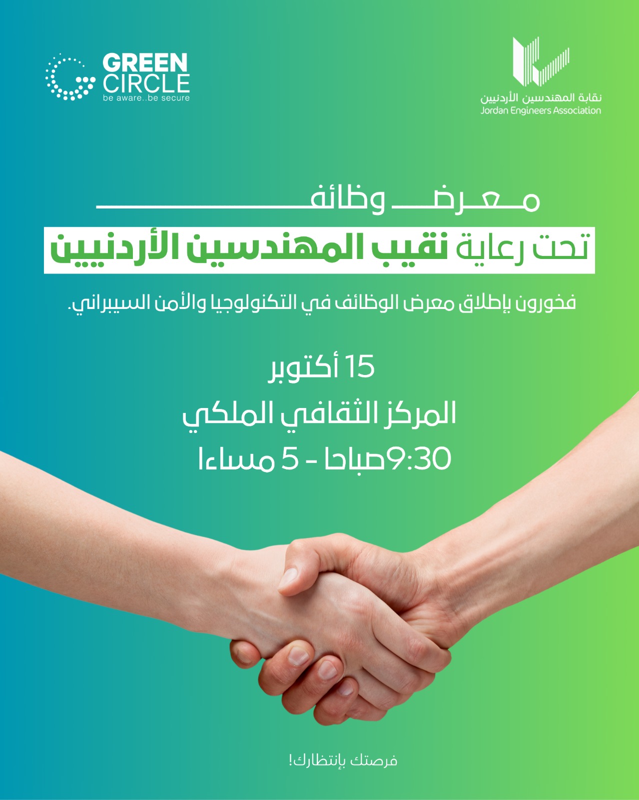 تطلق شركة الدائرة الخضراء، برعاية نقابة المهندسين، معرض التوظيف يوم 15 تشرين الأول 2025 في المركز الثقافي الملكي – عمّان، تحت رعاية نقيب المهندسين الأردنيين.